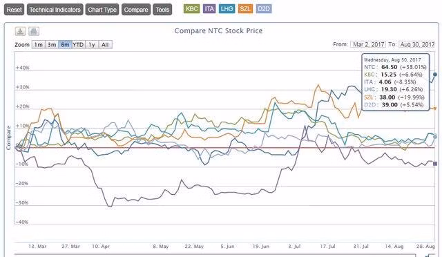 Về mức độ tăng trưởng, trong 6 tháng đầu năm, NTC tăng 16% doanh thu và 130% lợi nhuận so với cùng kỳ năm trước. Đây cũng là doanh nghiệp có mức tăng lợi nhuận cao nhất trong nhóm ngành. Lợi nhuận ghi nhận đột biến từ khoản lãi tiền gửi, lãi cho vay gấp đôi cùng kỳ năm trước, đạt 35 tỷ đồng. Ngoài ra, cổ tức lợi nhuận được chia cũng gấp 2,3 lần, đạt 16,8 tỷ đồng.