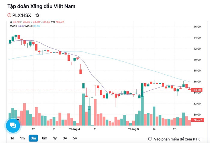 Trên thị trường chứng khoán, cổ phiếu PLX hiện vẫn chịu áp lực điều chỉnh. Kết thúc phiên giao dịch ngày 30/5, mã này giảm 1,15% còn 34.500 đồng/cổ phiếu với khối lượng khớp lệnh gần 761.000 đơn vị.