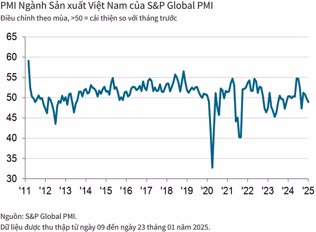 Chỉ số PMI ngành sản xuất Việt Nam đạt kết quả 48,9 điểm trong tháng 1/2025, giảm so với 49,8 điểm của tháng 12/2024 và nằm dưới ngưỡng 50 điểm tháng thứ hai liên tiếp. Mức suy giảm của các điều kiện hoạt động là vừa phải, nhưng đáng kể hơn một chút so với kỳ khảo sát trước.