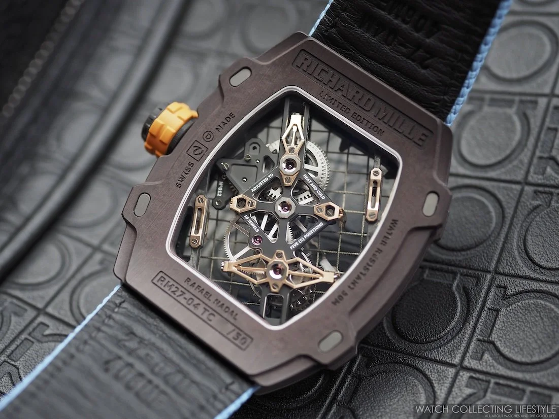 Trong những năm qua, Nadal và nhà sản xuất đồng hồ Richard Mille đã cùng nhau phát triển khá nhiều mẫu đồng hồ đáng chú ý, như RM 27-04, RM 27-03, RM 27-02, RM 27-01, RM 027, RM 35-02, RM 035 và RM 35- 01. Về chiếc RM 27-04 Kỷ niệm 10 năm Rafael Nadal, phiên bản này thuộc loạt đồng hồ giới hạn với số lượng chỉ 50 chiếc trên toàn cầu ra mắt nhân kỷ niệm 10 năm hợp tác thương mại cùng một trong những cái vĩ cầm tay nhất mọi thời đại. Đây là mẫu đồng hồ nhẹ nhàng đến mức khó tin nhờ trang bị máy có trọng lượng chỉ 3,4g.