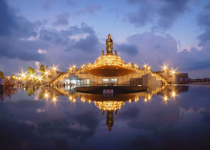 Có tổng diện tích lên tới 4,410 m2, bên trong khối đế chân Tượng Phật Bà là các phòng trưng bày, triển lãm nghệ thuật Phật giáo…, đưa du khách du hành tới thế giới của đạo Phật qua nhiều tác phẩm nghệ thuật được chế tác, phục dựng tinh xảo và trưng bày theo những cách thức và công nghệ hiện đại, độc đáo.