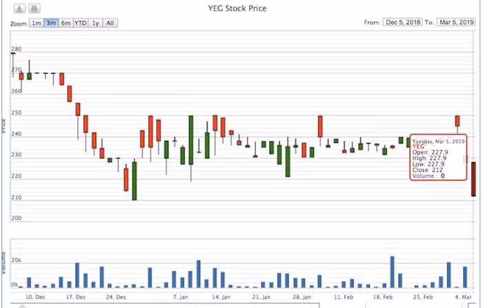 Trong vòng 4 tháng qua, cổ phiếu YEG đã liên tục giảm mạnh sau khi xác lập đỉnh giá 300.000 đồng/CP- trở thành cổ phiếu đắt nhất trên sàn. Hiện, thị giá cổ phiếu YEG đã giảm tới 35% so với giá đỉnh 350.000 đồng/CP lúc mới niêm yết.