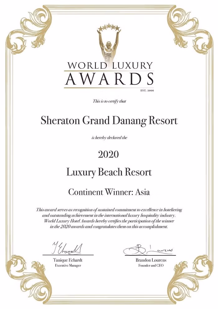 Vào tháng 11 năm nay, Sheraton Grand Đà Nẵng đã vinh dự nhận liên tiếp hai giải thưởng cao quý, bao gồm Khu nghỉ dưỡng biển sang trọng của châu Á (2020 Best Luxury Beach Resort of Asia), thuộc 2020 World Luxury Awards và Khách sạn hội họp hàng đầu Việt Nam (Best Meetings Hotel Vietnam), thuộc 2020 M&C Asia Stella Awards, do độc giả của ấn phẩm chuyên về hội họp và sự kiện M&C Asia bình chọn.