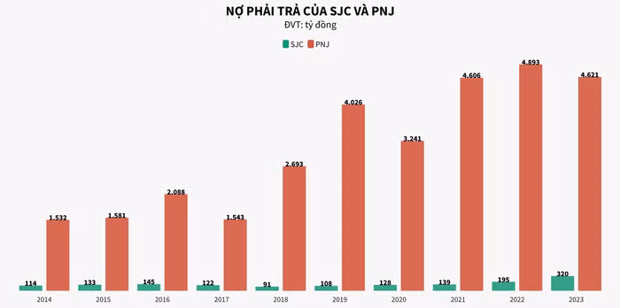 Một điểm đáng lưu ý khác, SJC là doanh nghiệp trực thuộc sở hữu 100% của nhà nước, cụ thể là Uỷ ban nhân dân TP.HCM, nên cơ cấu vốn có tỷ trọng nợ chiếm rất ít với trung bình chưa đầy 9% tổng nguồn vốn trong 10 năm qua. Ở chiều hướng ngược lại, PNJ là thương hiệu tư nhân, sử dụng đòn bẩy tài chính tương đối cao với nợ chiếm gần 44% nguồn vốn.