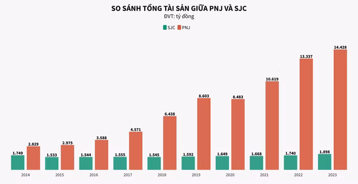 Tương tự, tổng tài sản của PNJ luôn duy trì trạng thái tăng liên tục qua các năm thì ở chiều ngược lại, tổng tài sản của SJC gần như không thay đổi.