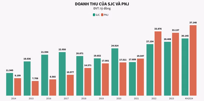 Xét trên tiêu chí về doanh thu, trong giai đoạn từ 2014-2020, SJC luôn dẫn trước đối thủ về tiêu chí này. Nhưng bước ngoặt xuất hiện từ năm 2021, doanh thu PNJ lần đầu vượt SJC. Cụ thể, SJC mang về 17.689 tỷ đồng doanh thu; còn ở PNJ đạt 19.735 tỷ đồng.