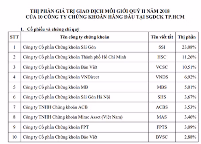 Sở Giao dịch chứng khoán TP.HCM (HoSE) vừa công bố danh sách 10 công ty chứng khoán (CTCK) có thị phần môi giới cổ phiếu và chứng chỉ quỹ lớn nhất trong quý II và bán niên năm 2018. Riêng 10 công ty này đã chiếm tới 73% thị phần toàn thị trường, với các tên tuổi dẫn đầu như SSI, HCM, VCSC, BVSC, VND…