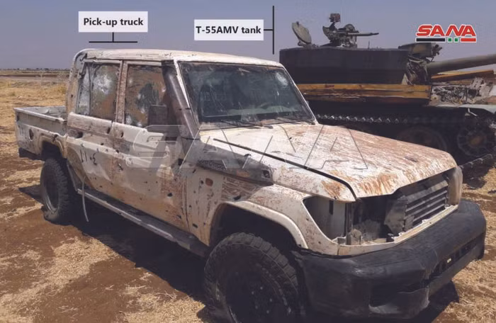 Xe tăng T-55 và xe bán tải bị quân đội Syria thu chiến lợi phẩm trên chiến trường Hama