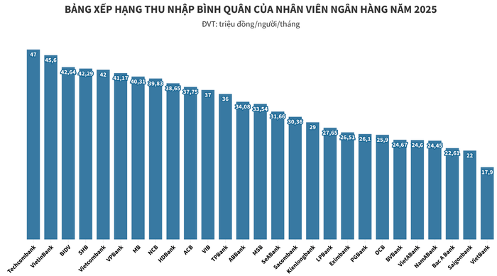 Dù giảm nhẹ khoảng 1 triệu đồng so với năm 2024, Techcombank vẫn giữ vị trí dẫn đầu với mức thu nhập bình quân khoảng 47 triệu đồng/người/tháng – cao vượt trội so với mặt bằng chung và gần gấp ba lần mức thu nhập của ngân hàng đứng cuối bảng xếp hạng là VietBank.