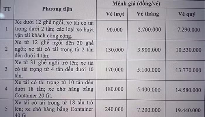 Giá vé cao nhất là loại xe xe tải có tải trọng từ 18 tấn trở lên; xe chở hàng container 40fit(xe nhóm 5) là 240.000 đồng/lượt.