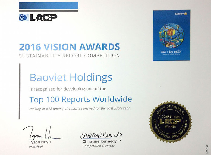 Năm nay Bảo Việt đã thể hiện sự bứt phá với báo cáo mang chủ đề “Em yêu Biển” (Save Our Ocean), một chủ đề mang tính thời sự và một thông điệp có sức lan tỏa mạnh mẽ. Vượt qua 1.000 báo cáo của các tập đoàn hàng đầu trên thế giới như Abbott, Coca Cola, WPP… Bảo Việt đã bứt phá vào trong Top 18 Báo cáo Phát triển bền vững xuất sắc nhất thế giới. Đây được coi là một cú huých tiếp sức cho những nỗ lực vươn tầm quốc tế của doanh nghiệp Việt.
