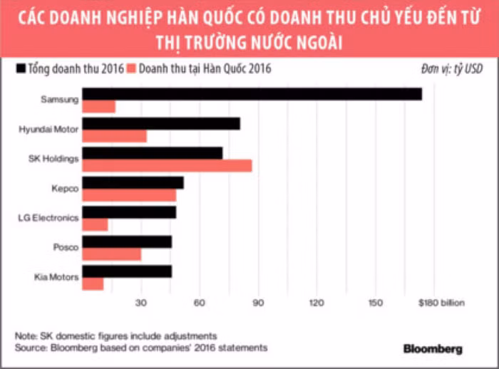 Hàn Quốc là quê nhà của nhiều thương hiệu nổi tiếng toàn cầu, một trong số đó là Samsung Electronics Co. Tuy nhiên, hiện tại, chỉ 10% trong số 174 tỷ USD doanh thu của tập đoàn này tới từ thị trường nội địa. Tương tự, Hàn Quốc chỉ đóng góp 1/4 doanh thu của LG Electronics Inc.