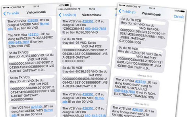 Ngày 6-9, chị Phạm Thị Minh Hạnh cho biết tối 1-9, khi chị đang đi với bạn ở bên ngoài thì điện thoại báo có tin nhắn từ thẻ Visa Debit của Ngân hàng TMCP Ngoại thương Việt Nam (Vietcombank) liên tục thông báo tài khoản phát sinh giao dịch. Tổng cộng, có 4 giao dịch thành công với tổng số tiền hơn 20 triệu.