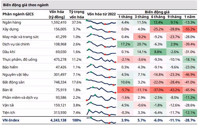 Các ngành nhạy cảm với lãi suất đã dẫn dắt đà phục hồi của VN-Index. Dịch vụ tài chính (+17,2% MoM), bất động sản (+10,6% MoM), nguyên vật liệu (+4,5% MoM) và ngân hàng (+4,4% MoM) tăng tốt trong tháng 3. Ngoài ra, vận tải có mức tăng 4,5% nhờ sự hồi phục của ngành du lịch và chính sách mở cửa trở lại của Trung Quốc.
