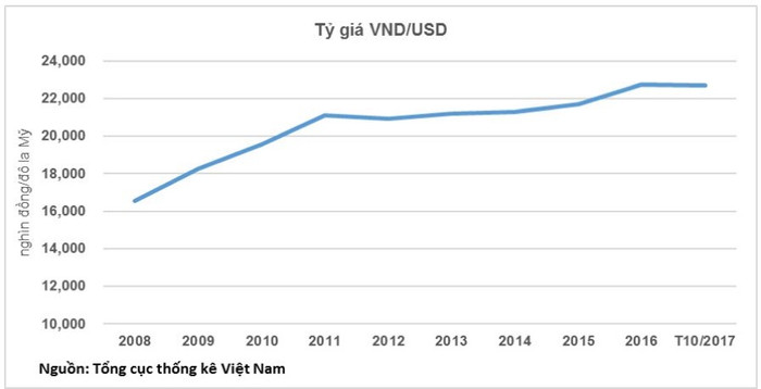 Cụ thể, tỷ giá mặc dù đã tăng từ nhiều từ mức khoảng 16.000 VND/USD vào năm 2008 nhưng tỷ giá đã trở nên ổn định hơn rất nhiều kể từ năm 2012 vào lúc nền kinh tế ổn định và đi lên trở lại.
