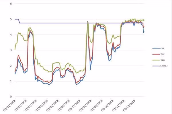 Giai đoạn quí 4, khi lãi suất liên ngân hàng thực sự căng thẳng, liên tục neo cao, các kỳ hạn 1 tuần trở lên đã vượt hẳn ngưỡng lãi suất OMO. Tháng 10, NHNN bơm ròng hơn 92.000 tỉ đồng, mức lớn nhất kể từ tháng 3-2017 (tổng hợp từ website NHNN). Lãi suất qua đêm, chủ yếu được sử dụng trong vay vốn liên ngân hàng, duy trì dự trữ bắt buộc có lúc lên tới 5,1%.