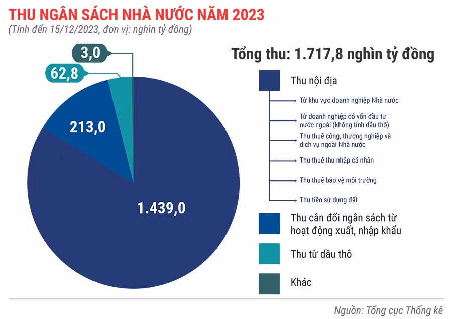Thu nội địa tháng 12/2023 ước đạt 149,6 nghìn tỷ đồng; lũy kế năm 2023 ước đạt 1.439 nghìn tỷ đồng, bằng 107,9% dự toán năm và giảm 0,3% so với năm 2022.