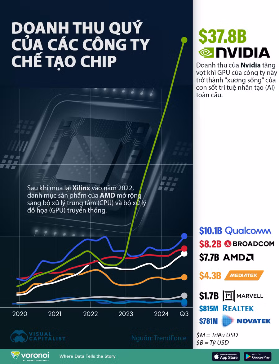 Đồ thị thông tin dưới đây thể hiện doanh thu quý của các công ty chế tạo chip hàng đầu thế giới, dựa trên số liệu tổng hợp từ công ty nghiên cứu thị trường TrendForce.
