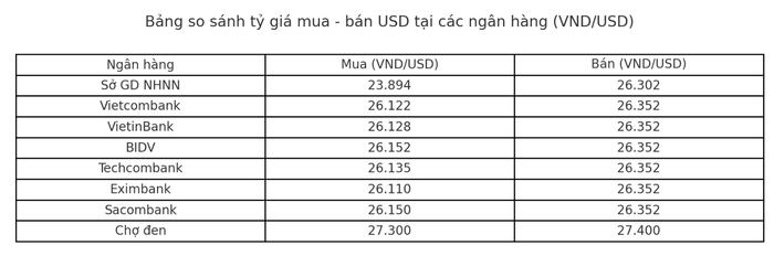 Tại Sở giao dịch Ngân hàng Nhà nước, tỷ giá mua – bán tham khảo vẫn được duy trì ở mức 23.894 – 26.302 VND/USD. Trên thị trường ngân hàng, giá USD nhìn chung khá ổn định, chỉ ghi nhận VietinBank và Techcombank điều chỉnh nhẹ, giảm lần lượt 11 đồng và 8 đồng ở chiều mua so với hôm qua. Các ngân hàng còn lại giữ nguyên biểu giá, trong đó giá mua USD dao động quanh 26.110 – 26.152 VND/USD, còn giá bán phổ biến ở 26.352 VND/USD.