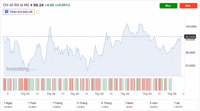 Trên thế giới, chỉ số USD Index - thước đo sức mạnh của USD so với 6 đồng tiền chủ chốt (EUR, JPY, GBP, CAD, SEK, CHF) phục hồi từ mức thấp, vượt ngưỡng 99 điểm trong phiên vừa qua.