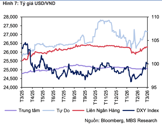 Ở góc nhìn khác, Công ty Chứng khoán MB (MBS) dự báo tỷ giá có thể tăng khoảng 2,5% – 3% trong năm 2026, với ba áp lực chính: nhập siêu quay trở lại, nhu cầu ngoại tệ liên quan đến vàng gia tăng, và sức mạnh của USD kéo dài hơn dự kiến.
