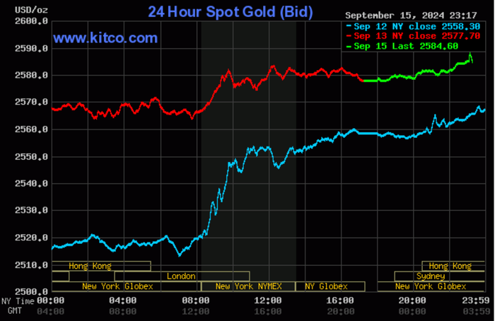 Trên thị trường thế giới, vàng giao ngay hiện đứng ở mức 2.584 USD/ounce, cao hơn 7 USD so với giá chốt phiên 13/9. Quy đổi theo tỷ giá hiện hành tại Vietcombank, vàng thế giới có giá khoảng 77 triệu đồng/lượng (chưa tính thuế, phí).