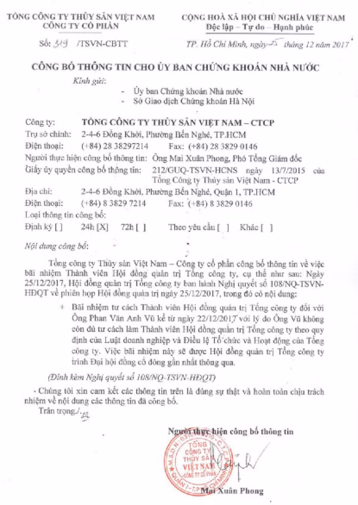 Trong ngày 25/12, Seaprodex đã họp HĐQT và ban hành nghị quyết bãi nhiệm tư cách Thành viên HĐQT với ông Phan Văn Anh Vũ kể từ ngày 22/12/2017.