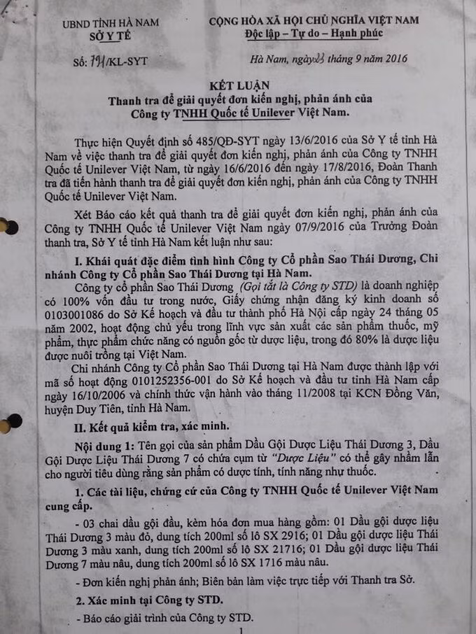 Ngày 23/9, Sở Y tế tỉnh Hà Nam đã ban hành kết luận số 791/KT-SYT “Thanh tra để giải quyết đơn kiến nghị, phản ánh của Công ty TNHH Quốc tế Unilever Việt Nam”.