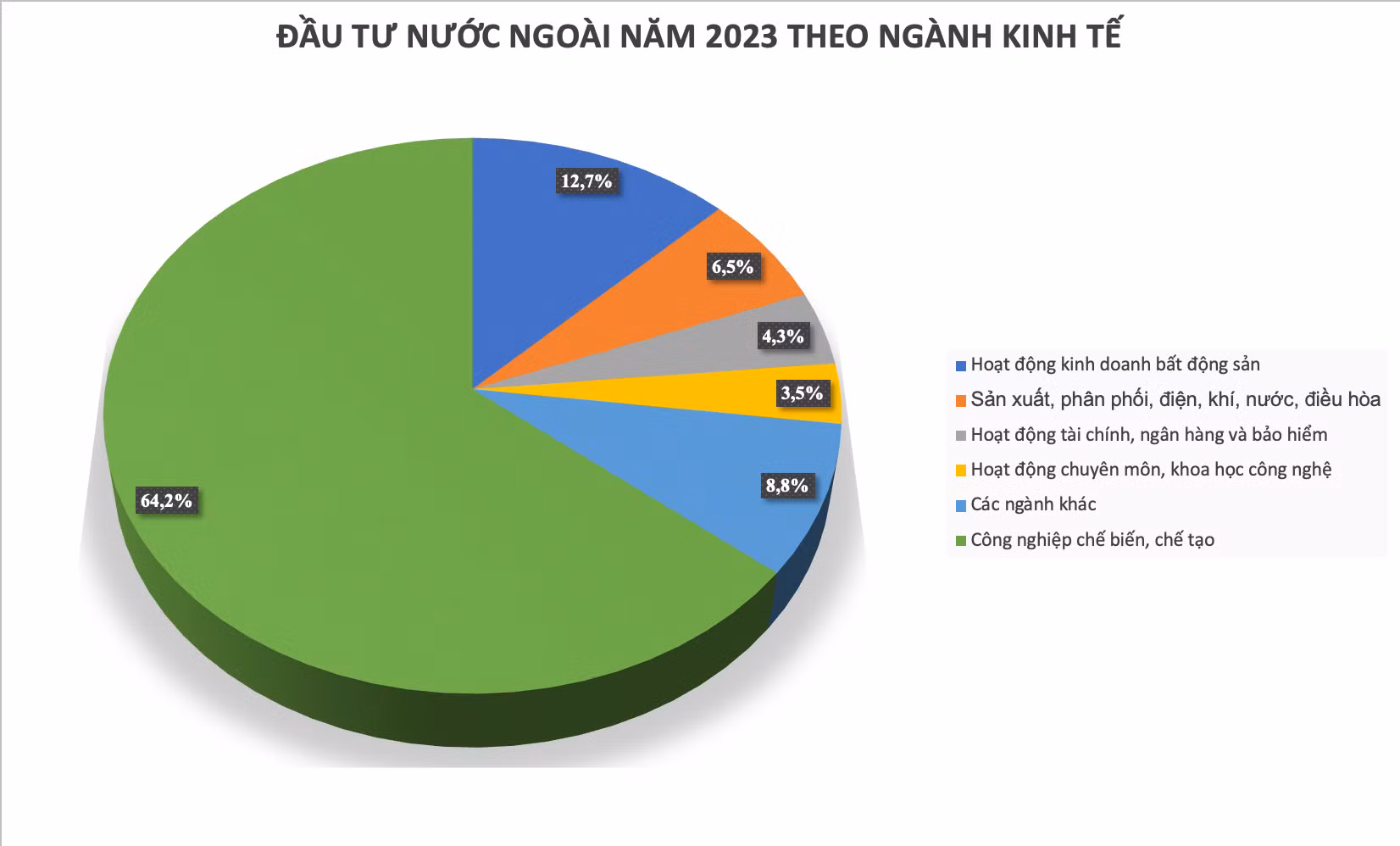 Trong năm qua, Việt Nam cũng có sự cải thiện đáng kể về chất lượng các dự án đầu tư. Phần lớn các dự án tập trung trong lĩnh vực công nghiệp chế biến, chế tạo (chiếm 64,2%). Trong đó có nhiều dự án quy mô lớn, sử dụng công nghệ cao trong các lĩnh vực điện tử, sản xuất chất bán dẫn, công nghiệp phụ trợ, ứng dụng công nghệ tiên tiến…