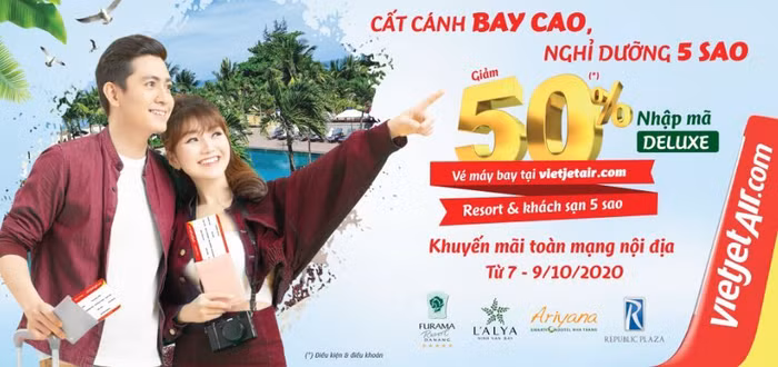 Đặc biệt, hành khách của Vietjet cũng có thể dùng mã “DELUXE” trải nghiệm khách sạn đẳng cấp 5 sao trên cả nước như L’Alya Ninh Van Bay, Ariyana SmartCondotel Nha Trang (Nha Trang), Furama Resort Da Nang (Đà Nẵng), Republic Plaza (TP.HCM) … với giá chỉ một nửa (chưa bao gồm thuế, phí) khi tiến hành đặt phòng với thời gian lưu trú phù hợp hành trình bay và có áp dụng điều kiện & điều khoản của các khách sạn.