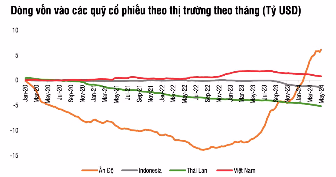 Dòng vốn vào cổ phiếu thị trường mới nổi (EM) rút 3 tỷ USD, nhưng khu vực Châu Á (trừ Nhật Bản) ghi nhận vào ròng 3,6 tỷ USD. Trong đó đáng chú ý nhất là thị trường Đài Loan (2,9 tỷ USD) nhờ dòng tiền vào các quỹ ETF, Ấn Độ (+1,5 tỷ USD) nhờ kỳ vọng vào kỳ bầu cử hay Trung Quốc (+988 triệu USD) nhờ lực mua từ nhà đầu tư cá nhân trong nước. Các thị trường Châu Á mới nổi khác đều khá yếu, đặc biệt là khu vực Đông Nam Á (rút ròng tháng thứ 4 liên tiếp với giá trị 174 triệu USD).