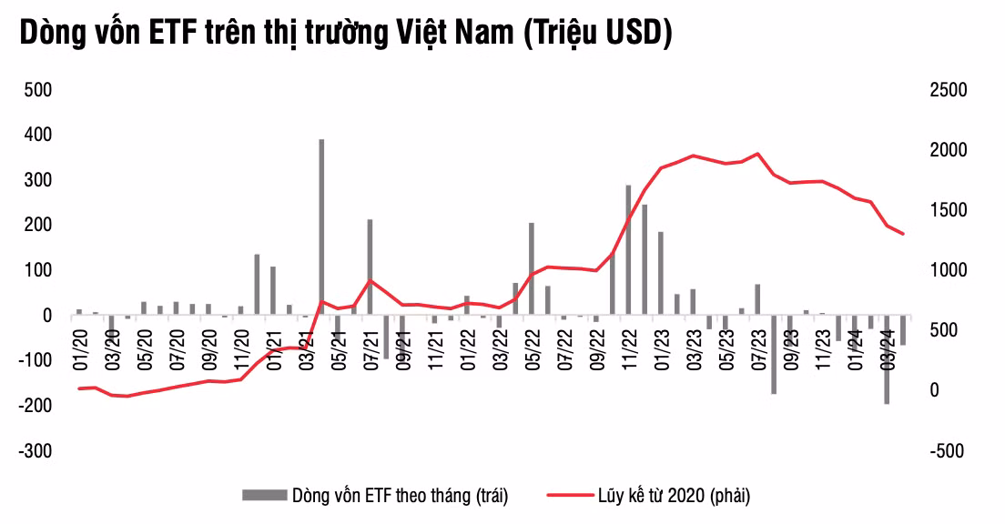 Các quỹ ETF tiếp tục chịu sức ép rút vốn mạnh trong tháng 4 với tổng giá trị là gần 3 nghìn tỷ đồng và ghi nhận là tháng rút ròng thứ 5 liên tiếp.