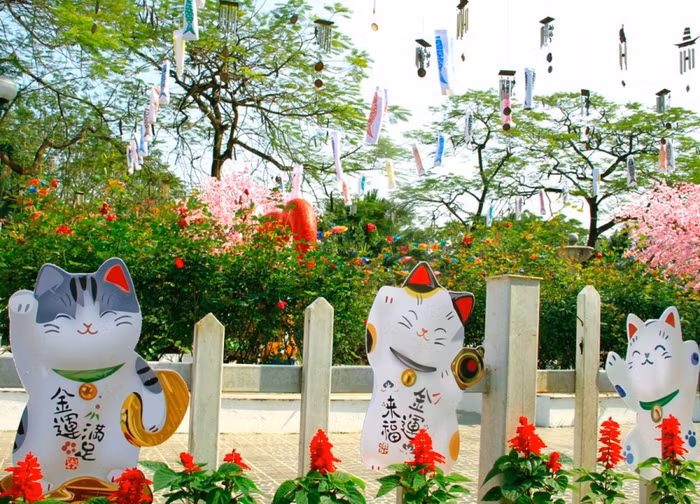 Trong không khí tưng bừng của năm mới, du khách sẽ được trải nghiệm những nét văn hóa nổi bật của đất nước Nhật Bản như vườn hoa anh đào với tiếng leng keng của chuông gió, hay màu sắc sặc sỡ của những chiếc đèn lồng cá Koi và những chú mèo thần tài ngộ nghĩnh.