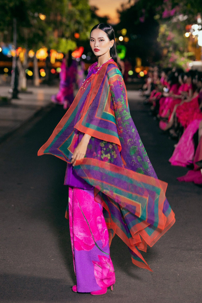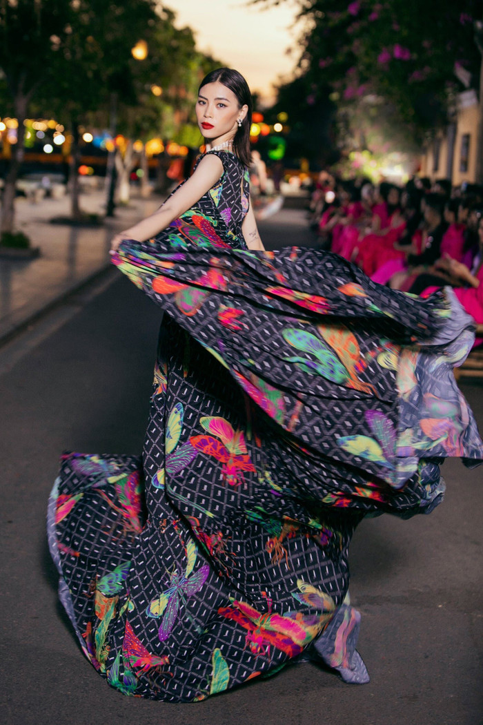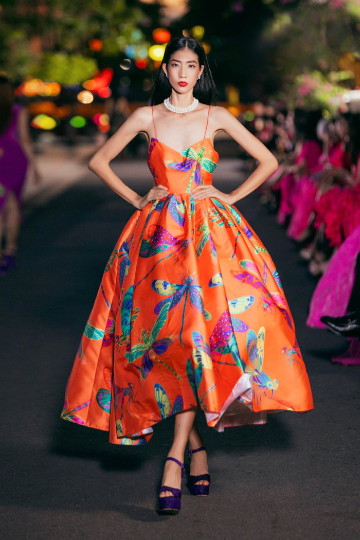 Những hình ảnh quen thuộc của Hội An như hoa giấy, chuồn chuồn, bắp ngô được cách điệu, đưa lên những thiết kế cơ bản quen thuộc của VUNGOC&SON. Trên nền màu sắc cam, hồng, tím, … các hoạ tiết càng thêm nổi bật. Đặc biệt, show diễn lần này còn có sự xuất hiện của sắc đen. Điều này khá lạ khi VUNGOC&SON được biết đến là bộ đôi “Phù thuỷ sắc màu”, và giới mộ điệu đã quá quen thuộc với những màu sắc rực rỡ đậm chất VUNGOC&SON. Tông đen được sử dụng tiết chế, như một lời gợi ý về bảng màu đa sắc. Khi phối cùng hoạ tiết to bản rực rỡ lại càng thêm phần nổi bật.
