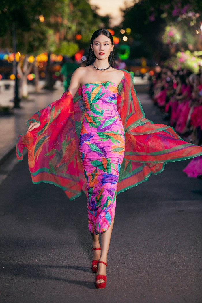 Siêu mẫu Minh Tú và Á hậu Kim Duyên xuất hiện từ phía bờ bên kia của dòng sông, catwalk đầy điêu luyện trên sàn runway nổi. Bộ đôi mang đến thiết kế đầm ngắn chữ A, đính kết hoa lá, phối cùng boots da đầy cá tính.